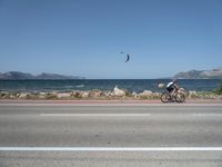 A man riding a bike along the coastal road in Mallorca, Spain. The clear sky and beautiful landscape of Balearic Islands create a stunning backdrop. The ocean waves and kite in the sky add to the natural beauty of this European destination.