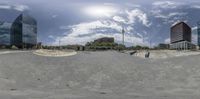 A vibrant view of the urban landscape of Barcelona, Spain. Modern architecture dominates the city center, with sleek office buildings and business districts. The open spaces feature concrete surfaces and pavers. Clouds drift overhead, adding to the European charm.