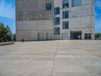 A view of a straight road in Spain surrounded by modern architecture in a business district. The clear sky enhances the sleekness of the concrete walls and pavers. An epitome of urban European architecture.