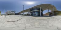 this is a mirror image of an open courtyard with a circular view of buildings in the background