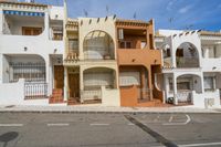 Classic architecture of tall multilevel townhouses in a suburban setting in Spain. These homes stand out against the coastal backdrop, with the ocean and cloudy sky in the distance. A perfect spot for tourists in Europe.