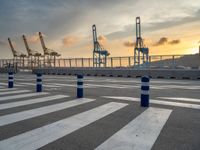 A modern architecture pier in Barcelona, Spain. The road leads to a vibrant coastal skyline with clear skies at dawn. The sun shines brightly on the open space, creating a sunny and inviting atmosphere.