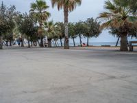 A gloomy day on the coast of Barcelona, Spain. The grey sky contrasts with the greenery and palm trees. Concrete surfaces meet the ocean, creating an open space along the coastline of Europe.
