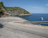This is an image of a coastal road in Spain, specifically in the Balearic Islands. The road is made of asphalt and winds along the edge of the water. The clear sky above contrasts with the blue ocean and provides a serene backdrop. The road includes curves and switchbacks, adding excitement and adventure to the journey. A jetty with a pier and a harbor can be seen in the distance. Armco barriers line the road, providing safety and protection. This photo captures the beauty and charm of the coastal roads in Spain, offering stunning views of the European landscape.