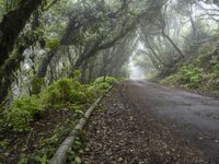 This image captures a gloomy day in the beautiful landscape of Tenerife, Spain. The road, covered in asphalt, winds through a forest of tall trees and dense vegetation. The grey sky is filled with fog and clouds, creating a hazy and atmospheric atmosphere. The natural environment of Tenerife is highlighted in this photo, showcasing the gloom and mist that often envelops the island. This scene evokes a sense of mystery and tranquility, offering a glimpse into the serene beauty of the European countryside.
