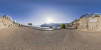 Aerial view of a coastal road in Mallorca, Spain. The low, curved road winds along the open space, offering a panoramic view of the ocean. The sun reflects off the mountains, creating a picturesque landscape.
