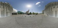 some birds and a person in a large circle on the sidewalk near buildings with sun on sky