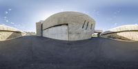A modern architectural marvel in Spain, this dome building stands tall against a clear sky. The straight road with a pedestrian ramp adds to the unique charm. A perfect blend of art and infrastructure.