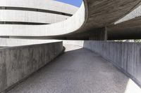 A monochrome view of a modern concrete bridge in Spain. The straight road leads to a low-lying urban space with Brutalist architecture. The composite material flooring and handrail add to the industrial feel of the city.