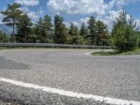 A scenic road in Pyrenees, Spain, winding through lush green forests. The road curves gracefully, lined with Armco barriers for safety. Clouds hover over the picturesque landscape of the Pyrenees mountains.