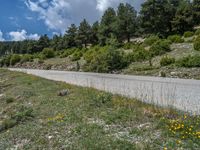 A scenic road in the Pyrenees of Spain, surrounded by lush greenery and towering mountains. The clear blue sky and fluffy white clouds add to the beauty of the European landscape.