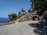 This is an image of a coastal road in Mallorca, Balearic Islands, Spain. The asphalt road winds through the landscape, with clear skies and the sparkling blue waters of the ocean in the background. The road passes through a tunnel, adding an element of intrigue to the scene. This photo showcases the natural beauty of Mallorca's coastal landscapes, capturing the essence of a sunny day in Europe. Whether you're a nature lover or a road trip enthusiast, this image is sure to inspire wanderlust.
