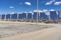 several rows of large solar panels against a bright blue sky with clouds and water behind them