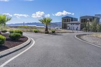A clear sky over the Tabernas desert in Spain, revealing the industrial landscape. Tar roads weave through the land, connecting warehouses and factories. Urban design meets nature as trees line the asphalt roads.