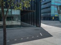 A modern office building in Barcelona's business district. The hard shadows cast on the asphalt surface reflect the vibrant city life. This urban design captures the essence of Spain's urban architecture.