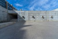 A modern architecture plaza in Zaragoza, Spain. The concrete walls create hard shadows under the clear European sky. The urban design and open spaces make it a perfect example of city life in Spain.