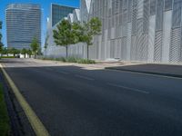 A modern architecture in Zaragoza, Spain. The metal wall casts a hard shadow on the road. Clear skies and clouds add depth to the urban landscape of this European city.