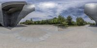 Modern architecture in Zaragoza, Spain. Two large buildings with curved metal railings stand at different heights, casting hard shadows on the open gravel area below. The straight road leads to the urban skyline in the distance.