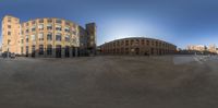 Classic architecture in Barcelona, Spain. Clear sky casts hard shadows on the brick walls. Cultural center surrounded by low-profile buildings. Cobblestone and concrete roads with a dirt and gravel surface.