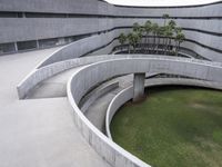 This is an image of a modern architectural structure in Tenerife, Spain. The high concrete building stands out against the cloudy sky, showcasing the urban design of the city. The composite material used in the construction gives the structure a unique texture and appearance. The landscape surrounding the building features a path and road, emphasizing the connection between the industrial and urban areas. This photo represents the hustle and bustle of city life in Europe, highlighting the elevated and elevated highway ramp. The structure also resembles a museum, symbolizing the blend of art and architecture in Tenerife.