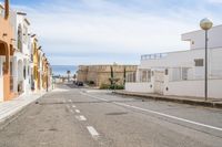 a street with some white buildings on one side and blue ocean in the distance and sky and buildings to the left