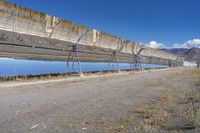 This image captures an old hydroelectric plant located in the Tabernas desert of Spain. The landscape features a combination of sand, water, and dirt, with an asphalt road leading towards the plant. The clear sky creates a beautiful backdrop for the scene, with clouds scattered across the horizon. The concrete bridge and vegetation add depth to the composition. Tall power lines and a metal fence frame the hydroelectric plant, providing a sense of scale. This photo showcases the unique combination of nature and infrastructure, highlighting the beauty of the Spanish landscape.