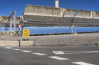 A view of a road in Tabernas, Spain. The asphalt and concrete road stretches over a bridge, reflecting its rectangular shape on the water. Clear skies and a solar plant in the landscape add to the scenic view.