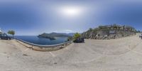 a 360 - view photo showing car driving along a curve by a beach and hill