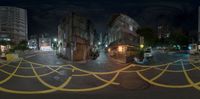 A unique perspective of a city street captured from two different angles, creating a spherical effect. The cityscape is illuminated by vibrant neon lights, creating a captivating nighttime scene. Taipei's iconic Taipei 101 tower stands tall in the background.