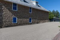A residential stone building with two windows and a small paved sidewalk below it and a fence. The clear sky above Toronto suburb provides a perfect backdrop. This house is situated in a peaceful neighborhood, featuring a well-maintained surface for pedestrians. The Canadian suburban setting adds charm to this inviting home.