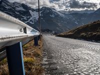 there is a metal railing on a stone road side way with mountains and hills in the background
