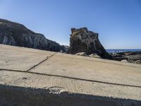 This stock photo showcases a stone walkway that guides viewers to the beach and water's edge of a picturesque rocky coastline. The coastal landscape features stunning views of the ocean and nearby mountains. The walkway is made of concrete, surrounded by wood and asphalt surfaces, blending seamlessly into the natural terrain. The clear sky and clouds on the horizon enhance the scenic beauty of the location. This image captures the serene and idyllic atmosphere of a day in nature, found in Portugal, a country in Europe known for its stunning coastal landscapes.