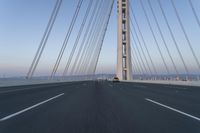 A stunning view of a straight road at dawn. The asphalt road surface stretches into the horizon, leading to a magnificent suspension bridge. The clear blue sky emphasizes the beauty of the break of day. The motion blur effect adds a sense of speed and movement, capturing the infrastructure and the mode of transport. The cable-stayed bridge stands tall, inspiring awe and representing the marvel of modern architecture.
