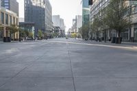 This is an image of a modern cityscape in Denver, Colorado, USA. The photo captures the clear sky above the high-rise buildings and urban infrastructure. The straight road leads through the metropolitan area, lined with modern architecture and concrete streets. The city's vibrant energy is evident in the busy streets and bustling city life. This photo represents the urban design and architectural beauty of Denver, showcasing the town's dynamic atmosphere and the public spaces that contribute to its unique charm.