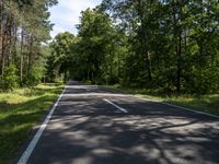 Straight road stretching through a forest in Berlin. The asphalt glistens under the clear sky, casting hard shadows on the landscape. A perfect day for a scenic drive.