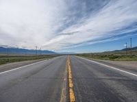 Straight down the road in rural Colorado, surrounded by endless mountains and a pristine natural landscape. Clouds dot the endless sky on a sunny day. A picturesque scene on an endless road in the USA.