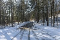 This stunning landscape photo captures a straight road in a snowy winter forest in Canada. The road surface is covered with freezing snow, leading the way through the forest. The sunlight filters through the clear sky, illuminating the trees and vegetation on both sides of the road. The branches and twigs of the trees create a beautiful natural environment. This scenic view is a perfect representation of the serene beauty of Canada's winter landscape.