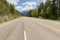 This image captures a straight mountain road in Canada's natural environment. The road surface, made of asphalt and tar, stretches into the distance, flanked by dense forest and vegetation. The majestic mountains can be seen in the far horizon, creating a stunning landscape backdrop. The clear sky above adds to the serene beauty of the scene. This photo showcases the breathtaking views of British Columbia and Alberta, showcasing the picturesque roads that wind through the mountainous terrain. It is a perfect representation of a peaceful day in nature.