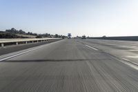 This stock photo showcases a straight asphalt road on a sunny day. The road surface lines extend towards the horizon, creating a mesmerizing visual effect. The image captures the motion blur as vehicles traverse the highway, adding a sense of automotive motion. A clear blue sky with sunshine highlights the public space and showcases the automotive design. An Armco barrier runs parallel to the road, ensuring safety and adding structure to the thoroughfare. The sun is visible in the image, enhancing the overall brightness and warmth of the scene.