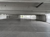 a empty car park with concrete walls and parking spaces and metal floors and walkways