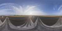 a street view with an empty parking lot in the middle of the road, and in the background are some very long white lines that lead to different directions