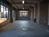 a large open floor with light shining on it's surface and brick walls, exposed ceilings and windows