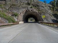 A picturesque view of a straight road in Colorado, surrounded by majestic mountains and beautiful natural landscapes. Clear skies and fluffy clouds add to the scenic beauty. The road passes through a tunnel and under a bridge, showcasing the impressive infrastructure of the area.