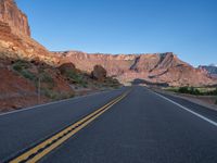 A straight road leading into the horizon with the Colorado River running alongside. The clear sky casts a hard shadow on the road and landscape. A breathtaking dawn in Utah's majestic canyon.