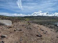 A straight road leads through the beautiful Colorado landscape, surrounded by open spaces and majestic mountains. The dirt and gravel surface adds to the ruggedness of the scenery, while a serene lake reflects the clouds on a clear day.
