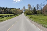 A straight road in rural Ontario, lined with lush green grass, trees, and vegetation. The road surface is smooth asphalt, with a guard rail and fence running along the side. Clouds fill the sky above, creating a picturesque agricultural landscape.
