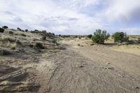 a large dirt road with some rocks and shrubs around it in the foreground of the desert