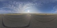 A fisheye lens image capturing the wide open landscaped area of Tempelhof in Berlin, Germany. The asphalt field stretches straight down the road, creating a symmetrical and calm atmosphere. The clear sky and sunlight illuminate the urban design and architecture, making it a perfect spot for various sports and recreational activities.