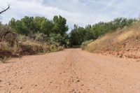 a dirt road with trees and dirt, with no people on either side of it