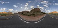 A straight road cuts through the breathtaking Utah landscape at dawn, casting long shadows on the asphalt. Clouds hover above the canyon. Nature's beauty and the open road await in the USA.